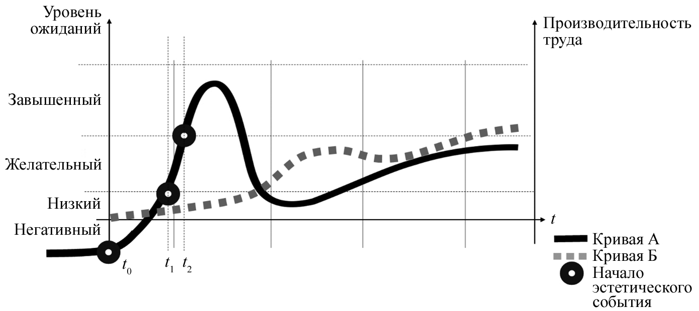 На эмпирическом уровне рассмотрения эта взаимосвязь может быть проиллюстрирована (рис. 2) графиком динамики ожиданий позитивных перемен, побуждаемых изменениями в эмоциональной среде под воздействием ряда корпоративных событий с эстетической нагрузкой (кривая А с точками эстетических воздействий на рис. 2) и динамики производительности живого труда (кривая Б).