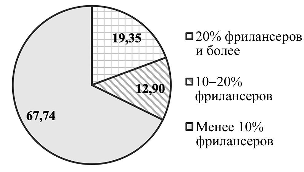 В ряде зарубежных исследований также выявлены некоторые взаимосвязи между уровнем развития фриланса и изучаемыми факторами. Например, Г. Варум с соавторами в своем исследовании удалось определить положительную зависимость между фрилансом и ростом инноваций в стране (Varun et al., 2020). Работа А. Бёрке и М. Коулинга посвящена изучению взаимосвязи между интенсивностью работы фрилансеров, эффективностью бизнеса и созданием рабочих мест. Установлено, что компаниям необходимо иметь не менее 11% фрилансеров от общего числа сотрудников для достижения положительных результатов для развития бизнеса и повышения привлекательности компании на рынке труда (Burke, Cowling, 2020).