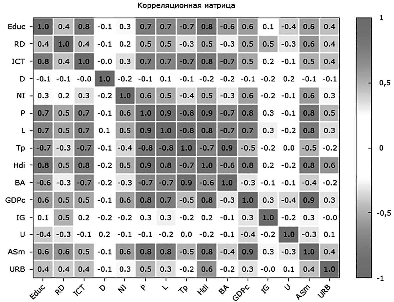 С целью исключить проблему мультиколлинеарности переменных, включаемых в регрессионную модель, построена корреляционная матрица и произведен отсев регрессоров с корреляцией ниже 0,7 (рис. 4). В результате в дальнейший анализ были включены шесть факторов: уровень расходов страны на НИОКР, уровень цифровизации государственных институтов, глобальный индекс сетевого взаимодействия, доля ИТ-отрасли в ВВП страны, уровень урбанизации и уровень безработицы.