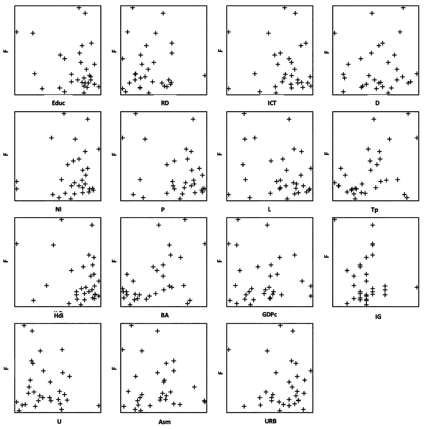 Проверка наличия взаимосвязей между зависимой и независимыми переменными произведена путем построения графиков разброса X–Y (рис. 5). Обнаружен чрезмерный разброс значений по следующим переменным: уровень развития фриланса (F), уровень цифровизации государственных институтов (D), ВВП на душу населения (GDPc), доля ИТ-отрасли в ВВП страны (IG). Разброс значений устраняется путем логарифмирования значений указанных переменных.