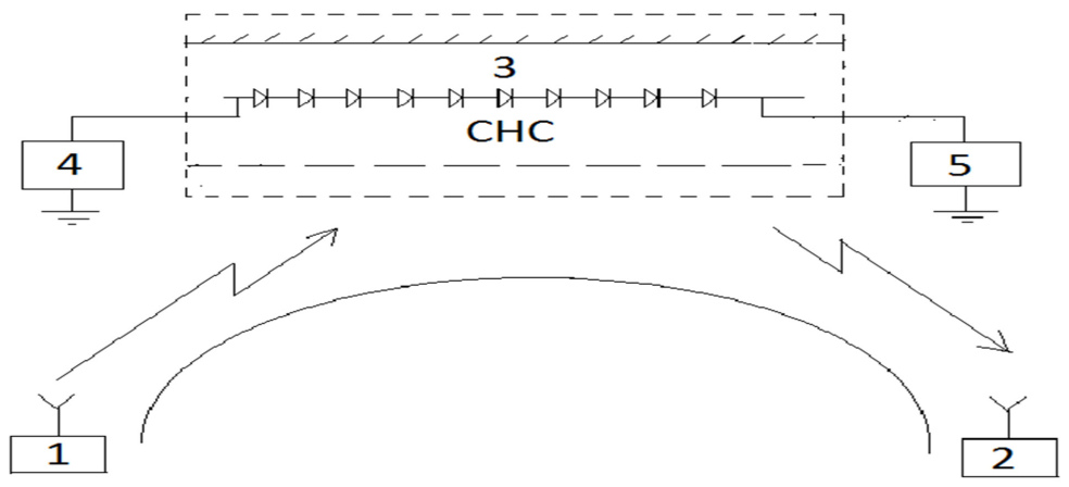 Благодаря этому СНС обеспечивает функции антенны, модулятора, демодулятора, согласующего устройства и фильтра. Первый и второй абоненты с традиционными приемопередающими станциями (1, 2) расположены в одном и том же полупространстве относительно плоскости неоднородности. Третий абонент находится в месте расположения СНС (3) и имеет возможность с ее помощью принимать, демодулировать сигналы первого и второго абонентов и регистрировать с помощью устройства (4). Одновременно переотраженный сигнал первого абонента может быть с помощью СНС промодулирован информационным сигналом третьего абонента с некоторой поднесущей частотой, который формируется с помощью устройства (5), и передан второму абоненту. Переотраженный сигнал второго абонента может быть с помощью СНС промодулирован информационным сигналом третьего абонента и передан первому абоненту.