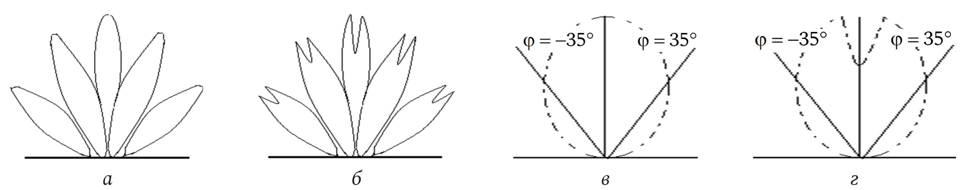 Рис. 3. Типичные моностатические (при совпадении углов падения волны от ЛА и углов измерения отраженного сигнала) ДОР линзы Люнеберга при периоде решетки УС, большем длины волны (а, б), при периоде решетки УС, меньшем половины длины волны (в, г), синфазном питании диодов в соседних столбцах решетки УС (а, в) и противофазном питании (б, г)