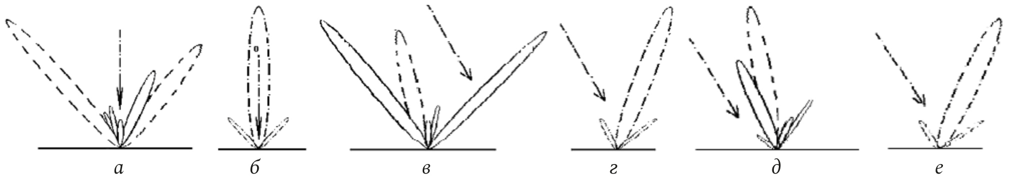 Рис. 4. Типичные бистатические (при разносе углов падения волны от ЛА и углов измерения отраженного сигнала) ДОР на плоскую СНС при синфазном питании диодов в соседних столбцах решетки УС