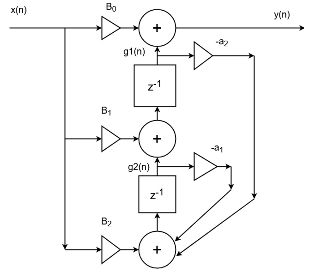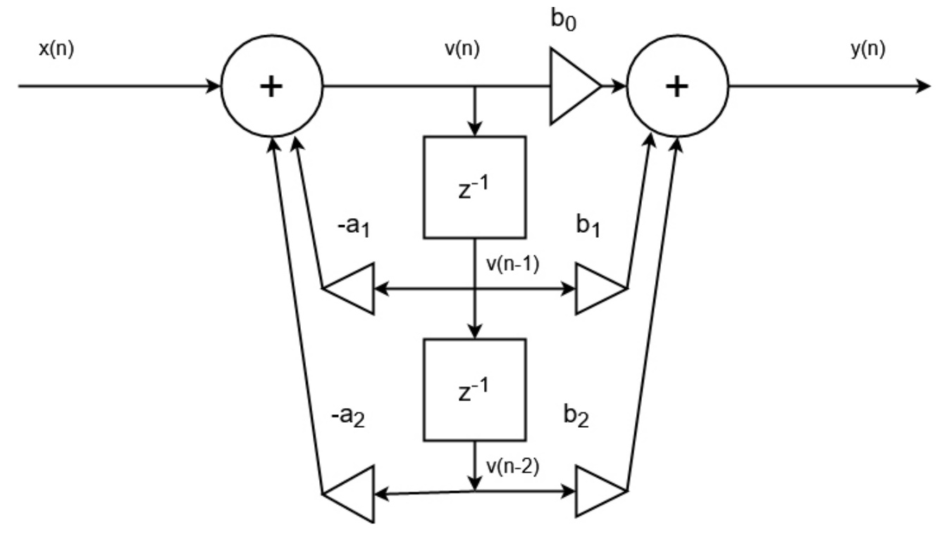 Левая часть схемы на рис. 1 называется нерекурсивной, а правая часть схемы с обратными связями – рекурсивной. Нерекурсивной части соответствует числитель выражения W(z), а рекурсивной части – знаменатель выражения W(z). Схему на рис. 1 называют прямой схемой реализации цифрового звена второго порядка. Блоки z–1 – это регистры, на них осуществляется задержка отсчетов цифровых сигналов на один такт.