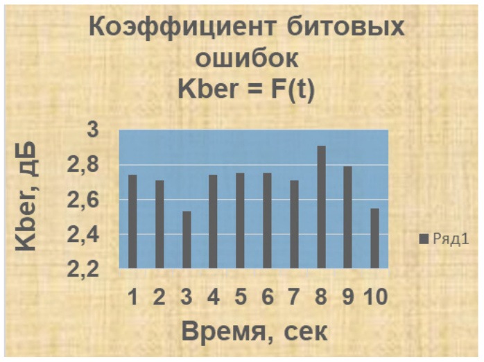 В качестве примера на рис. 3 приводятся значения Kber = lg(1/BER) во время воспроизведения видеопотока приемником на интервале 10 с в непосредственной близости от порога устойчивости с запасом менее одного дБ. На интервалах менее 10 с изображение визуально устойчиво, однако при увеличении времени приема на картинке иногда появляются артефакты и искажения – изображение «рассыпается на квадраты и пиксели», либо вовсе происходит полное замораживание.