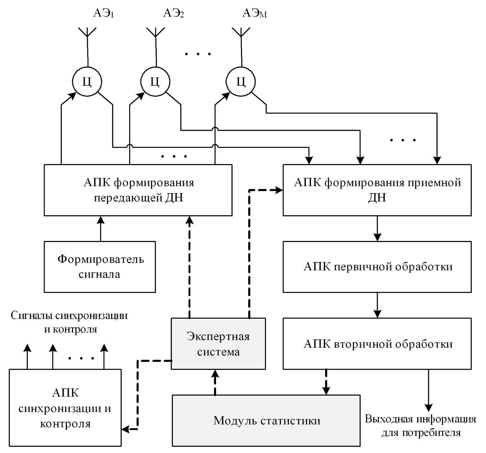 Несложно заметить, что предлагаемая структура интегрирует в систему управления АР все основные элементы радиолокационной системы, что отражает общую современную тенденцию интегрирования антенны в систему обработки сигналов и отличает от структуры РЛС предыдущих поколений, приведенную, например, в [10].