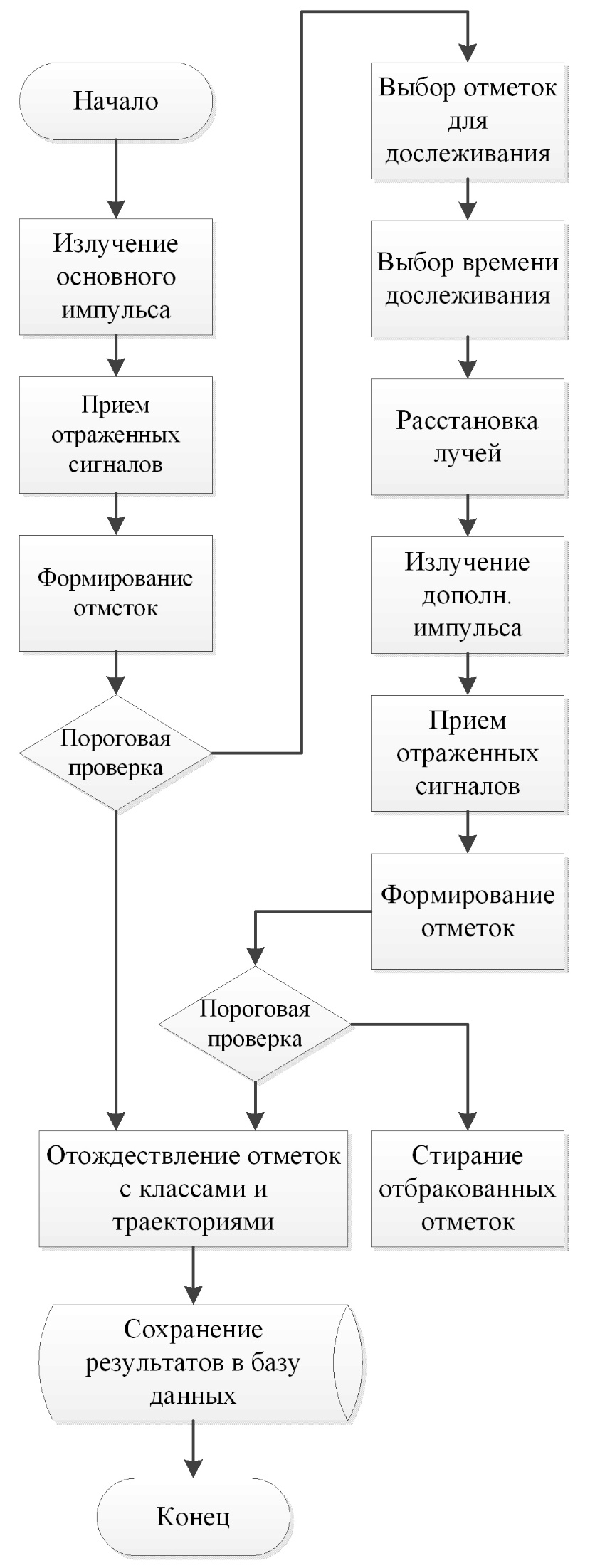 В соответствии с предложенным алгоритмом к существующей системе управления АР предъявляются требования к дополнительной установке передающего и приемных лучей на основе пороговой обработки. В соответствии со структурой на рис. 1 пороговая обработка может быть также совмещена с разделением объектов на классы и формированием траекторий, т. е. после реализации вторичной обработки сигналов. Это означает, что на рис. 2 предложен наиболее простой алгоритм обнаружения малозаметных целей, отвечающий структуре системы управления АР на рис. 1.