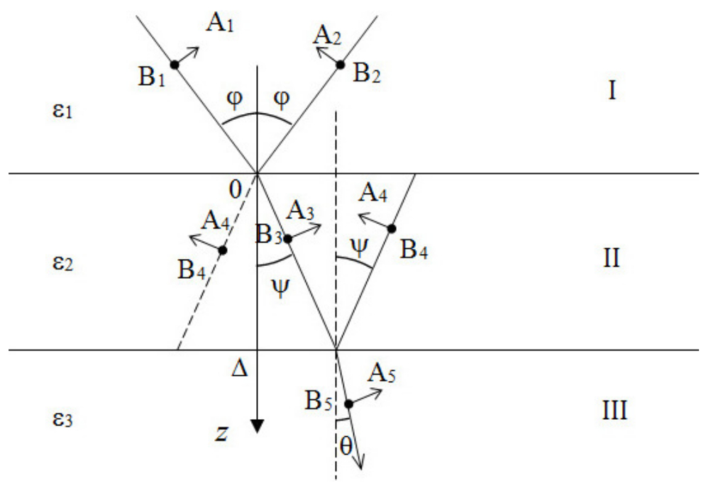 Расчет коэффициентов прохождения и отражения волн в многослойных структурах осуществляется на основе строгого метода двусторонних граничных условий [6], когда диэлектрический слой рассматривается как слой конечной толщины с комплексной диэлектрической проницаемостью. Поскольку электромагнитное поле в диэлектрическом слое можно представить в виде суперпозиции парциальных волн, к рассмотрению вопроса о записи граничных условий на верхней и нижней границах диэлектрического слоя II можно подойти с позиции задачи о прохождении плоской волны через диэлектрический слой, для которой применяются законы геометрической оптики.