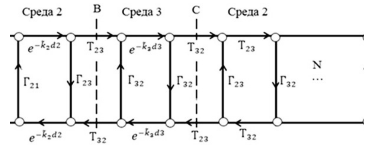 Построим ориентированный граф прохождения электромагнитной волны через периодическую многослойную структуру, рис. 2.