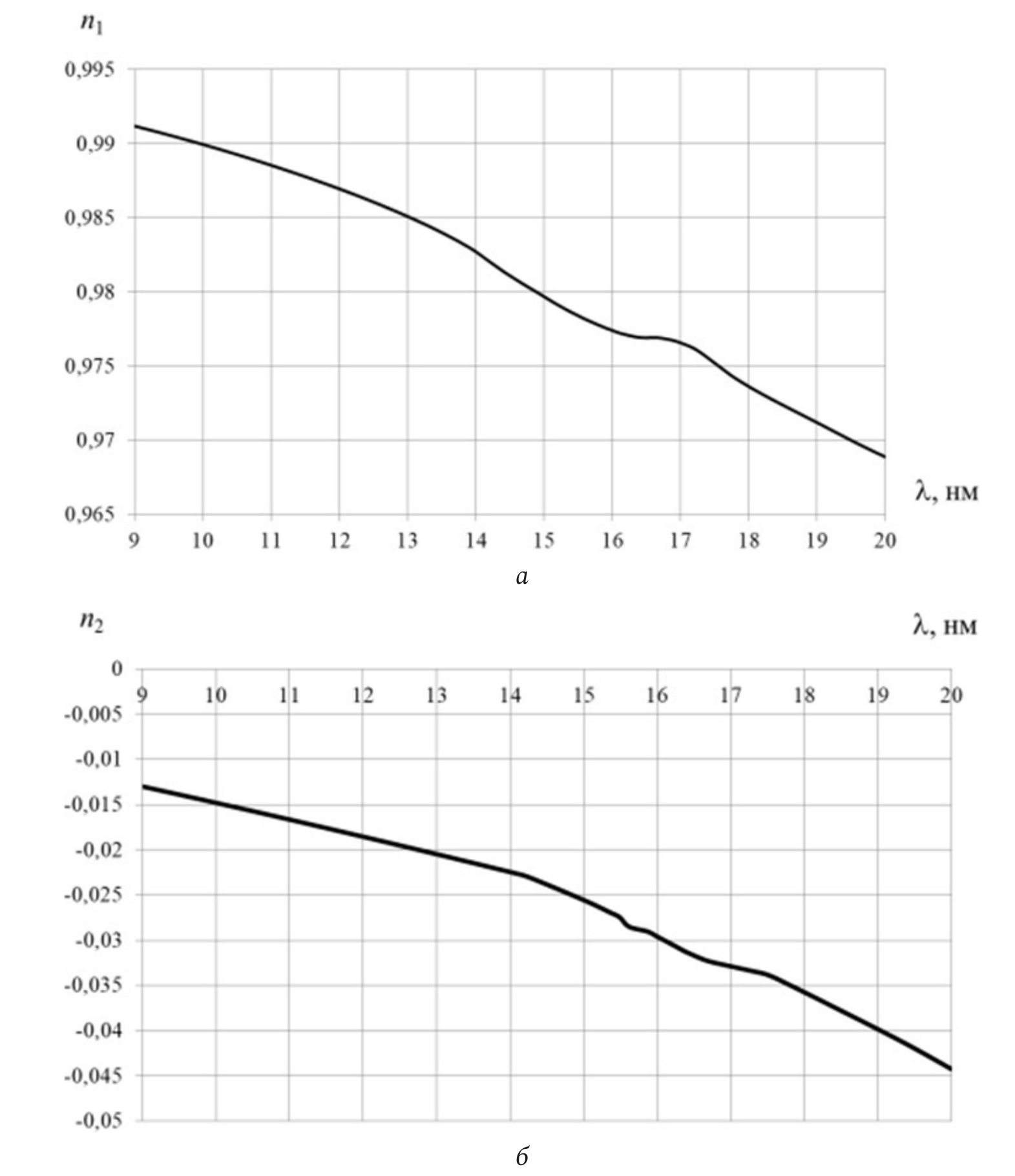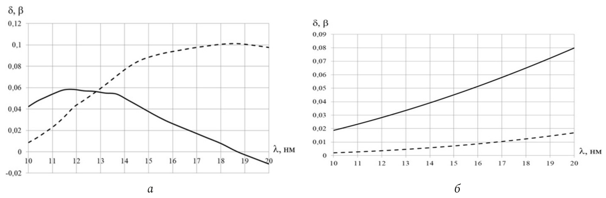 На рис. 3, а представлены зависимости добавок к показателю преломления для сурьмы, на рис. 3, б - для карбоната бора в диапазоне так называемого «мягкого» рентгеновского излучения. На рис. 3 сплошной линией показана зависимость добавки к действительной части показателя преломления от длины волны, пунктирной линией – мнимая часть показателя преломления