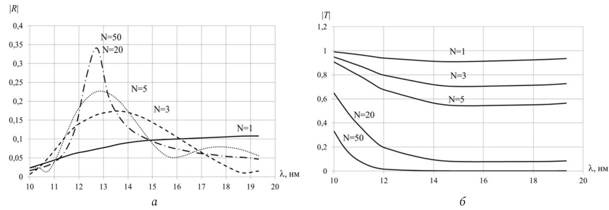 Рис. 4. Зависимости: а – модулей коэффициентов отражения и б – прохождения от длины волны при разном количестве слоев пары веществ сурьма/карбонат бора (Sb / B4C)