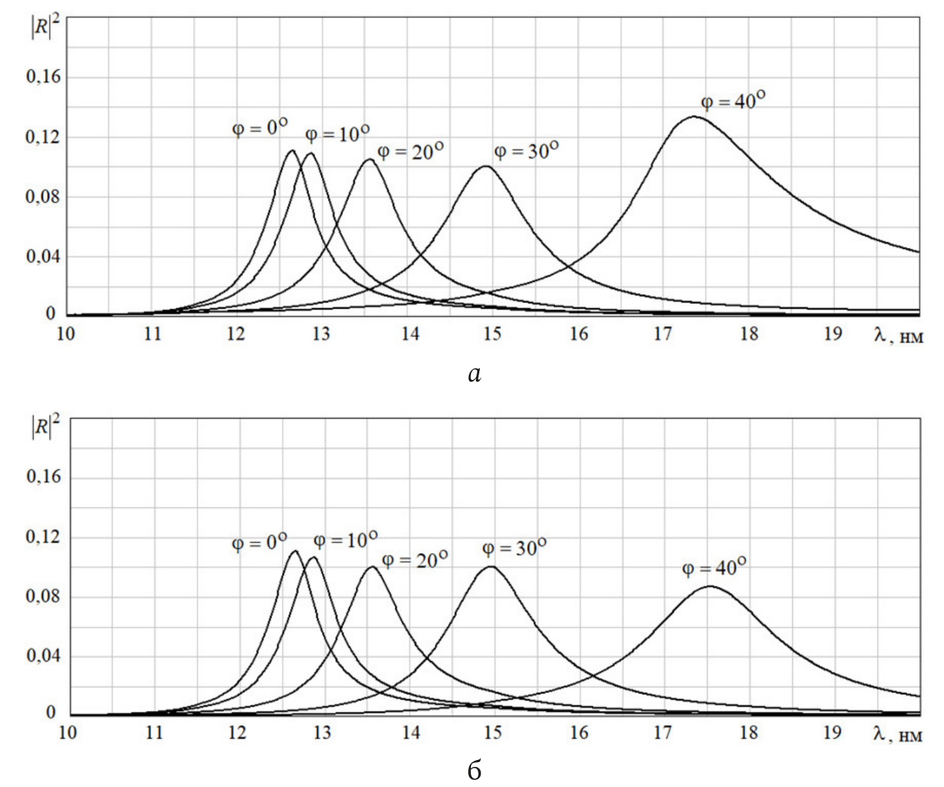 На рис. 5 приведены зависимости квадратов модулей коэффициентов отражения от длины волны для углов падения плоской электромагнитной волны 0°, 10°, 20°, 30°, 40° для структуры, состоящей из слоев пары сурьма/карбонат бора (Sb / B4C), количество пар периодов Sb / B4C 50, величина периода 6,6 нм (3,3 нм – Sb, 3,3 нм – B4C).