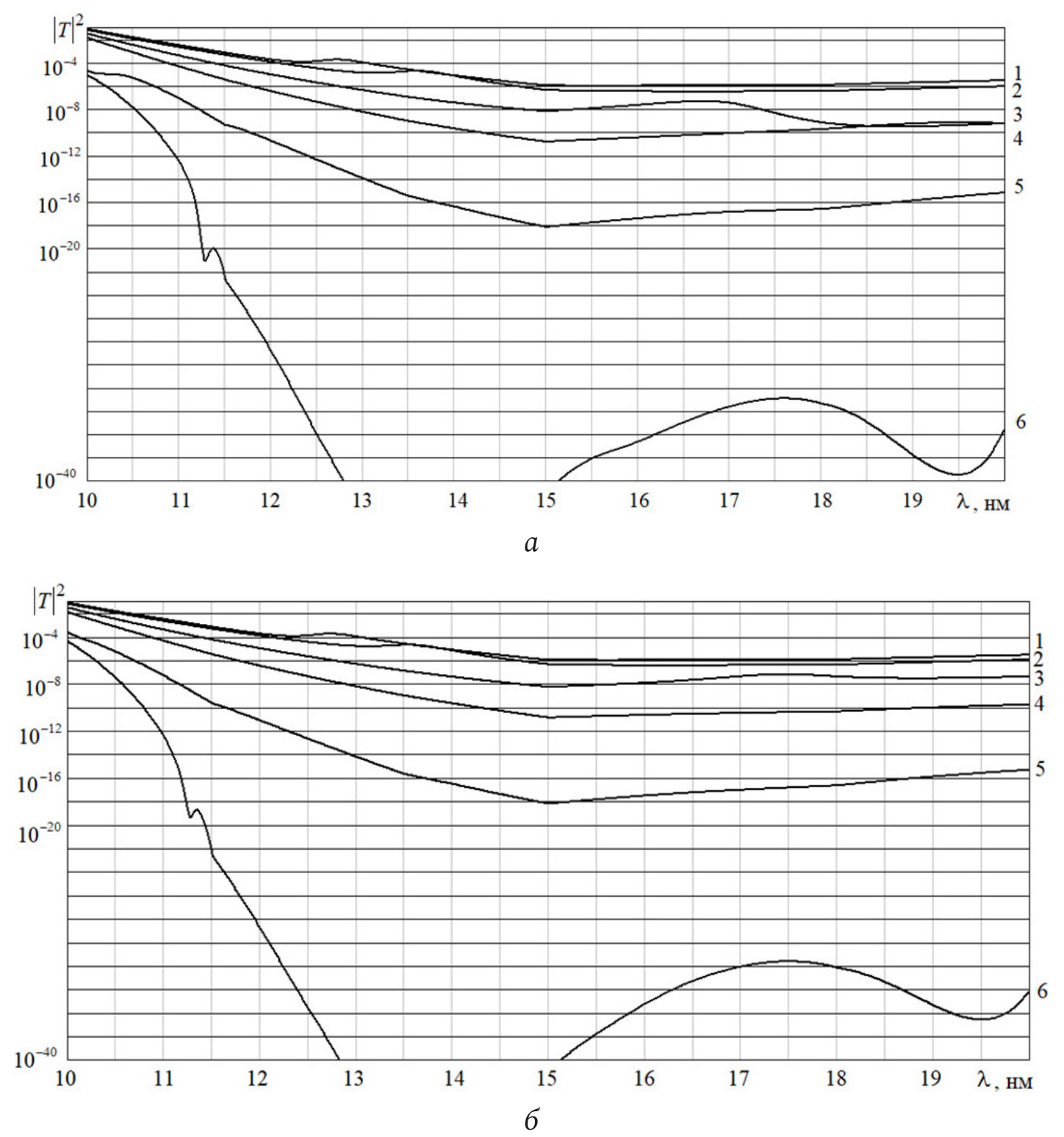 Fig. 6. Dependence of the squared moduli of the transmission coefficients on the wavelength for a structure consisting of layers of an antimony / boron carbonate (Sb / B4C) pair s-polarization (a) and p-polarization (b) for the angles of incidence of a plane electromagnetic wave: 1 – 0°, 2 – 20°, 3 – 40°, 4 – 50°, 5 – 60°, 6 – 65°