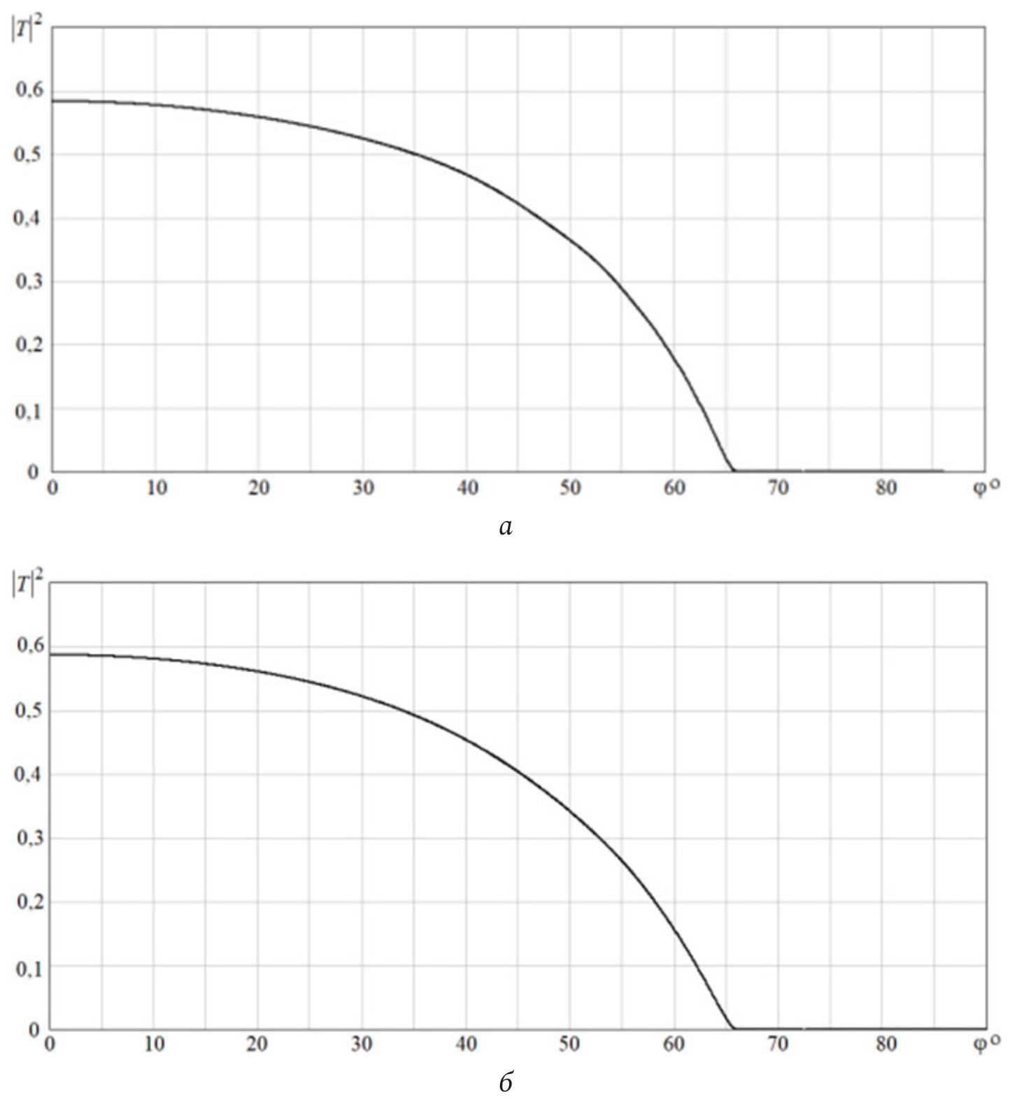 На рис. 7 приведена зависимость квадрата модуля коэффициента прохождения от угла падения на длине волны нм. При угле примерно наблюдается резкое уменьшение коэффициента прохождения для волн обеих поляризаций.