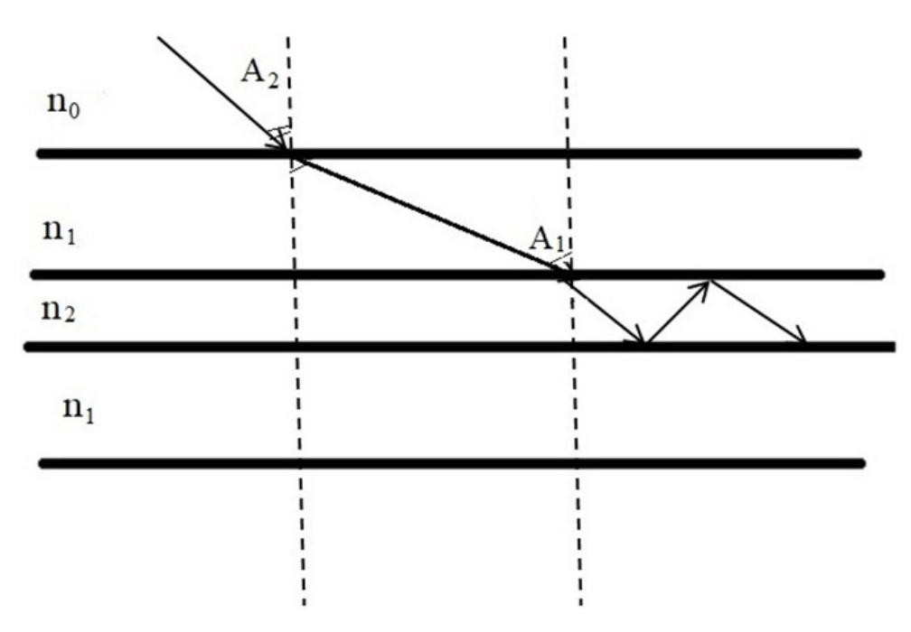 где d - толщина слоя, - угол падения, удовлетворяющий условию полного внутреннего отражения. При этом условии оба угла на верхней и нижней границах близки друг к другу.