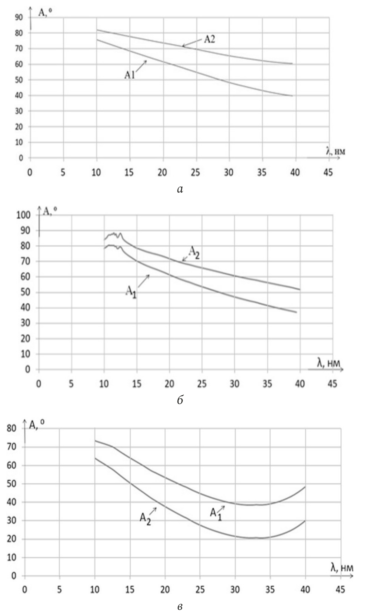 Рис. 9. Зависимости углов падения на рассматриваемую структуру A2 и на центральный слой A1 рассматриваемой структуры от длины волны, при которых волна становится направляемой: а – C60 / C3H6; б – Si3N4 / Au; в – BN / AgBr