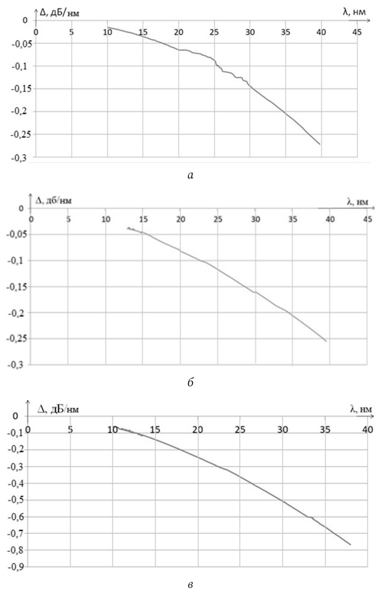 Рис. 10. Зависимости погонного затухания пленочной волны от длины волны: а – C60 / C3H6; б – Si3N4 / Au; в – BN / AgBr