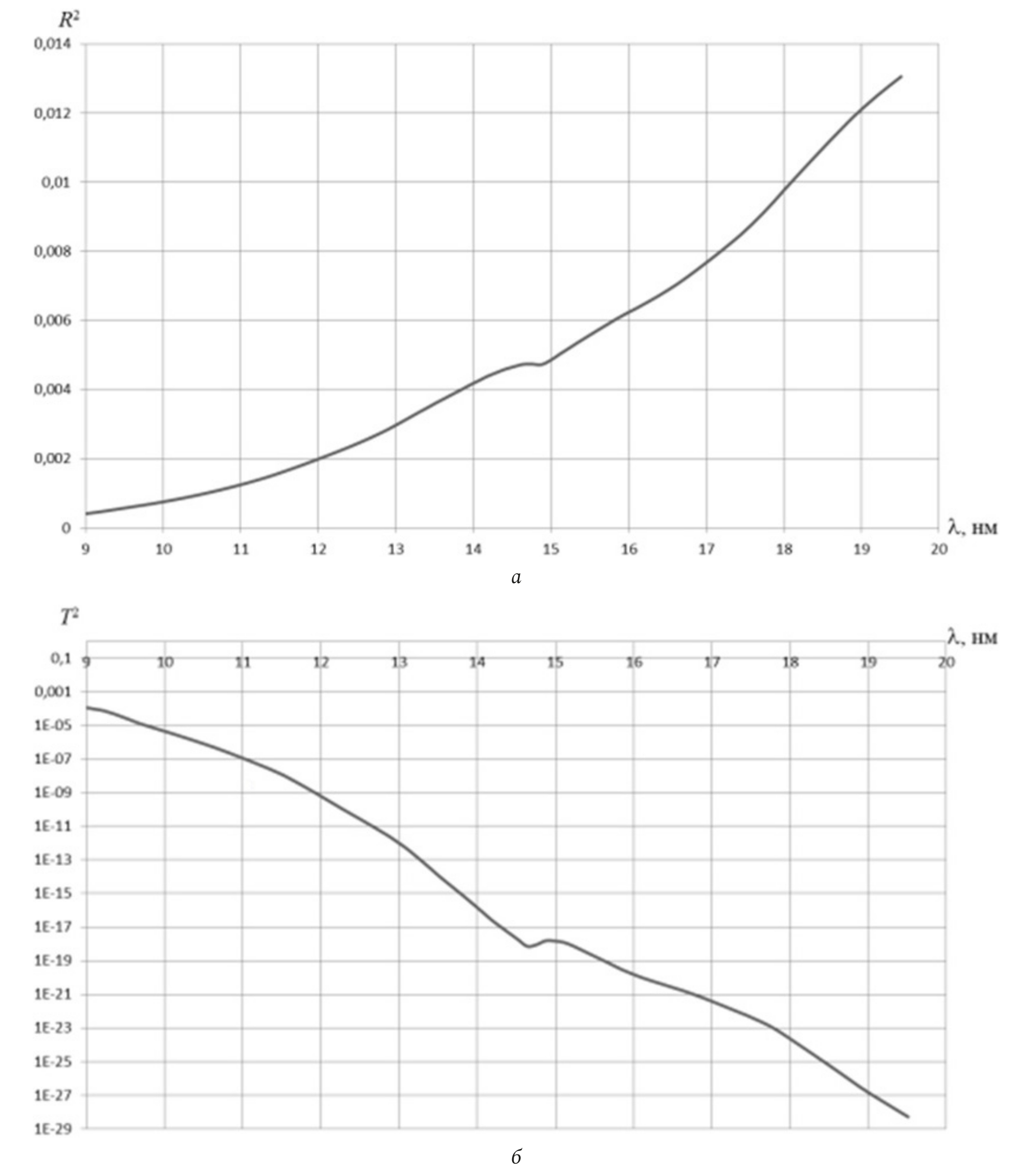 Сравнение результатов расчетов, полученных с использованием двух указанных методов, производилось для различного количества слоев многослойной структуры, углов падения в диапазоне длин волн от 10 до 20 нм. Отличие в результатах расчетов не превысило 5 %.