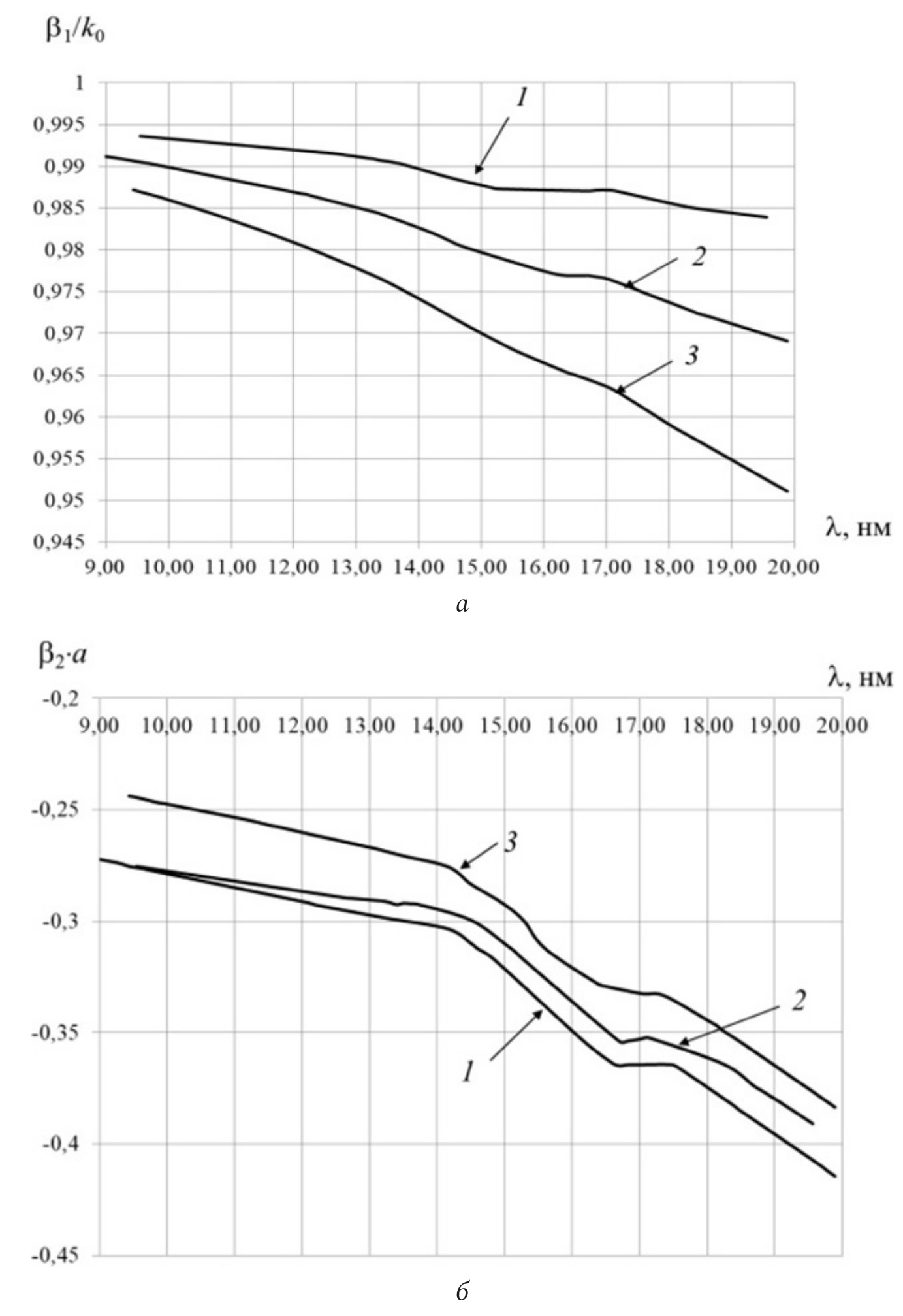 Fig. 13. Characteristics: a – dispersion and b – attenuation of the first three waves of an air cylindrical waveguide with a radius a = 30 nm, surrounded by ytterbium