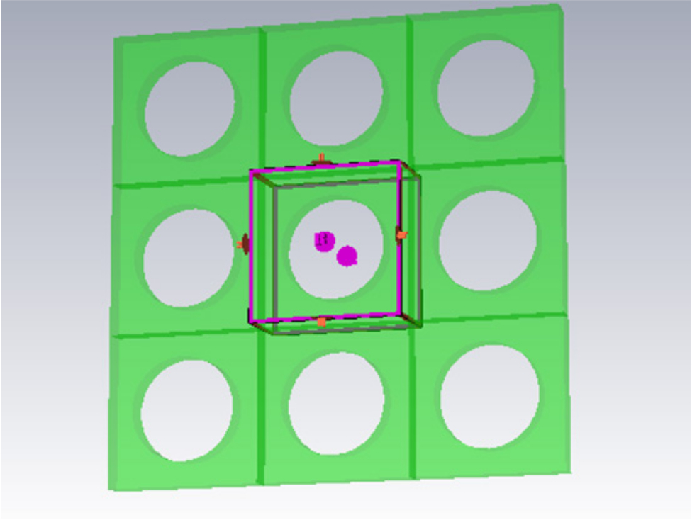 Рассмотрим применение указанной САПР для исследования прохождения излучения через материал с двумерно-периодической системой цилиндрических воздушных каналов, рис. 15. Метод анализа с граничными условиями в направлениях и Unit Cell позволяет анализировать структуру, бесконечно достраиваемую в этих направлениях.