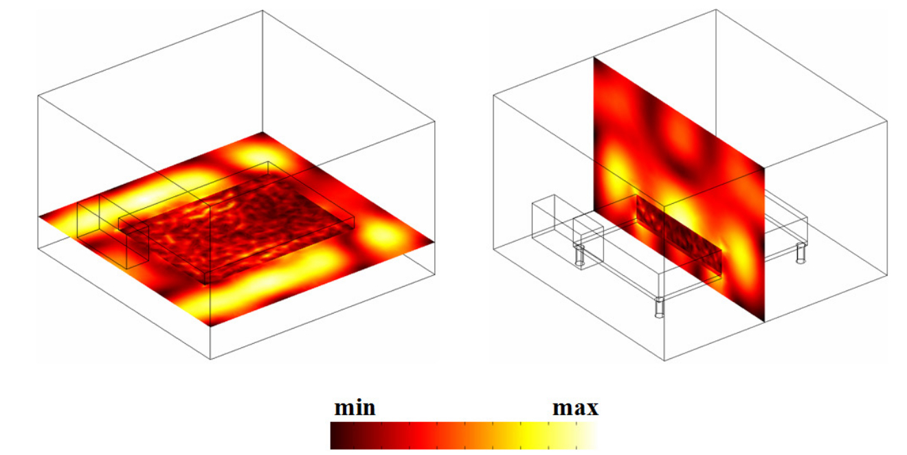 Fig. 3. Distribution of the electric field in the vertical plane of symmetry yz of the sterilizer at a frequency of 2,45 GHz