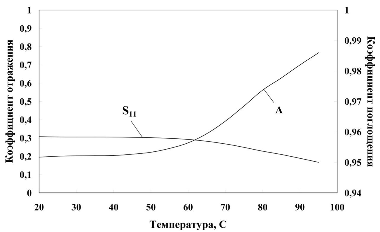 Температурные зависимости этих двух параметров на частоте 2,45 ГГц приведены на рис. 4. Из этих данных видно, что с ростом Т °С отраженная мощность плавно снижается почти в два раза, а поглощаемая мощность минимальная величина которой составляет Рп = 543 Вт при комнатной температуре 20 °С, плавно возрастает примерно в 1,06 раза и достигает величины 578 Вт. Интересно отметить, что этот эффект наблюдается, несмотря на уменьшение параметра