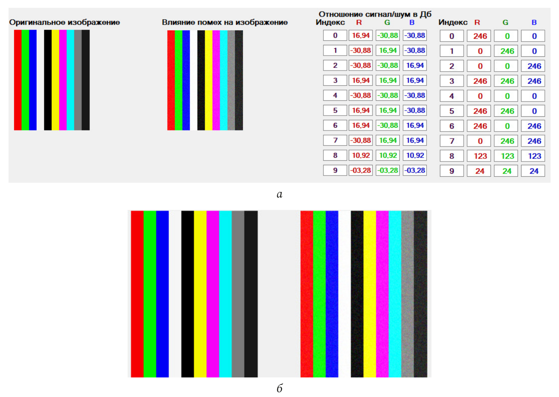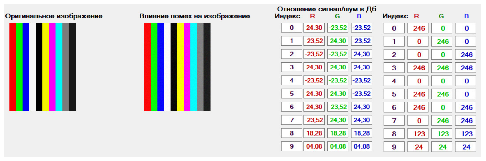 Из рис. 3 видно, что при минимальном уровне помехи изображения разных цветов практически не подвержены искажениям, кроме двух последних. Значение сигнал/шум у основных компонент (R, G, B) для каждой цветовой линии имеет около 50 % от первоначального (при наличии самой минимальной помехи).