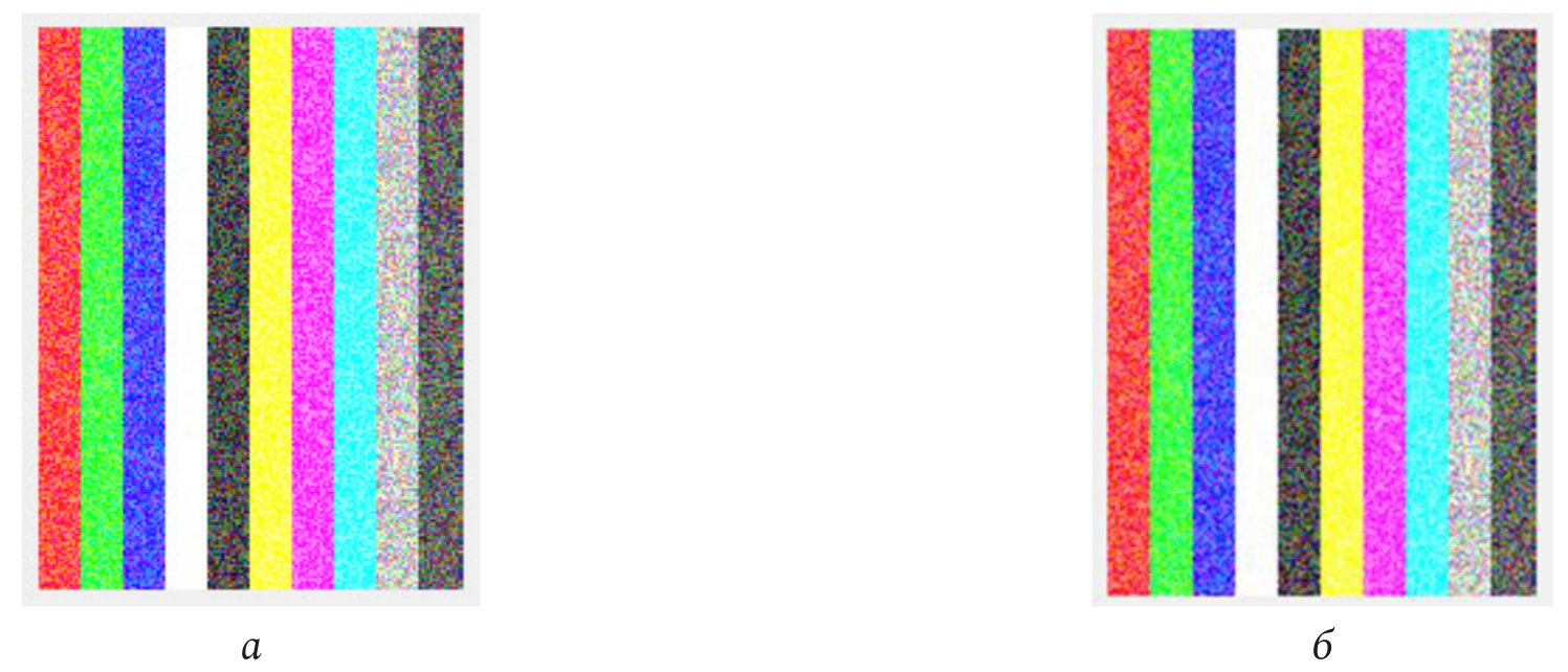 На рис. 4, б можно видеть различимое влияние помехи на изображения сразу двух основных цветов – синего и черного. Воздействие помехи нельзя назвать критическим, но оно вполне различимо для обычного наблюдателя. Значение сигнал/шум у основных компонент (R, G, B) для каждой цветовой линии имеет около 35 % от первоначального (при наличии самой минимальной помехи).