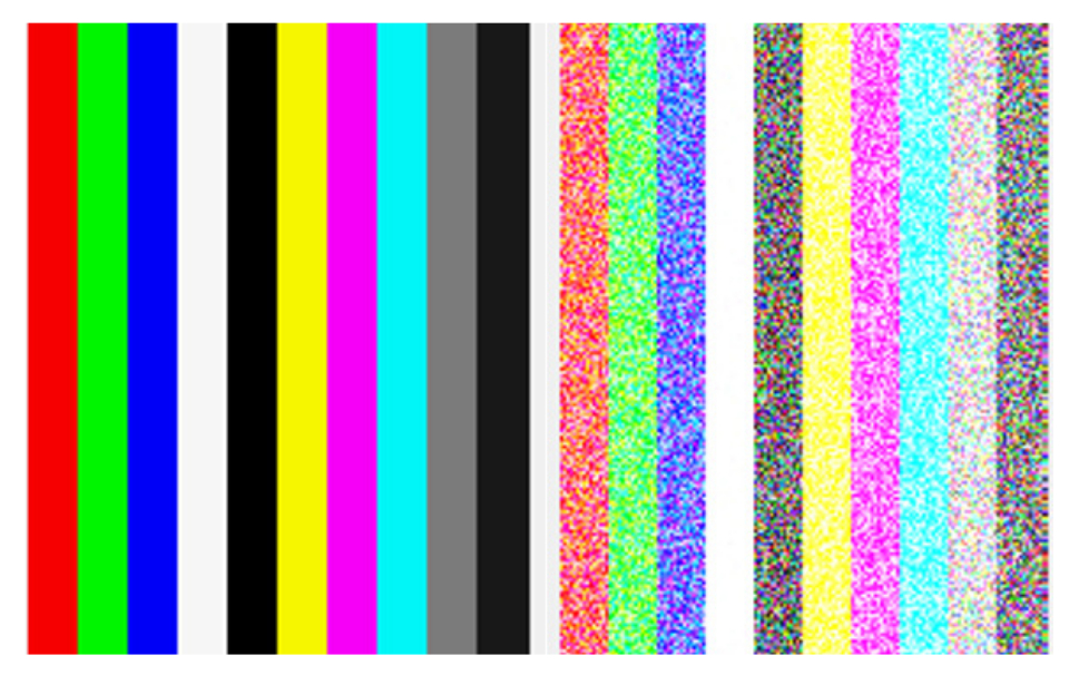 На рис. 5 можно видеть закономерное ухудшение качества изображений, описанных ранее, вследствие увеличения воздействия помехи. Здесь также можно отметить начало пагубных влияний на изображение красного цвета. Значение сигнал/шум у основных компонент (R, G, B) для каждой цветовой линии имеет около 25 % от первоначального (при наличии самой минимальной помехи).