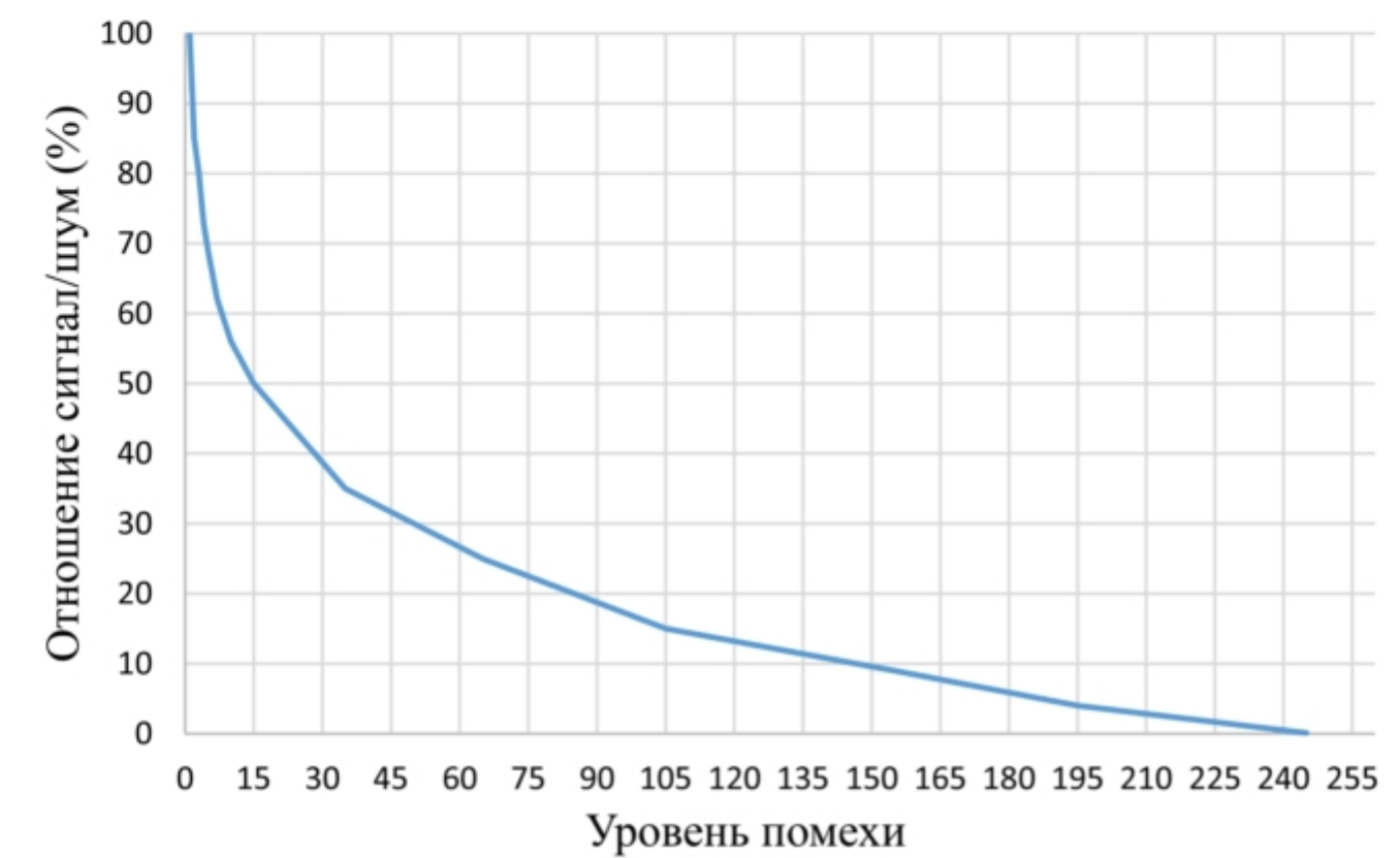 Таблица 1. Соотношения уровня помехи и значения сигнал/шум (%) / Table 1. Interference level and signal-to-noise ratios (%)