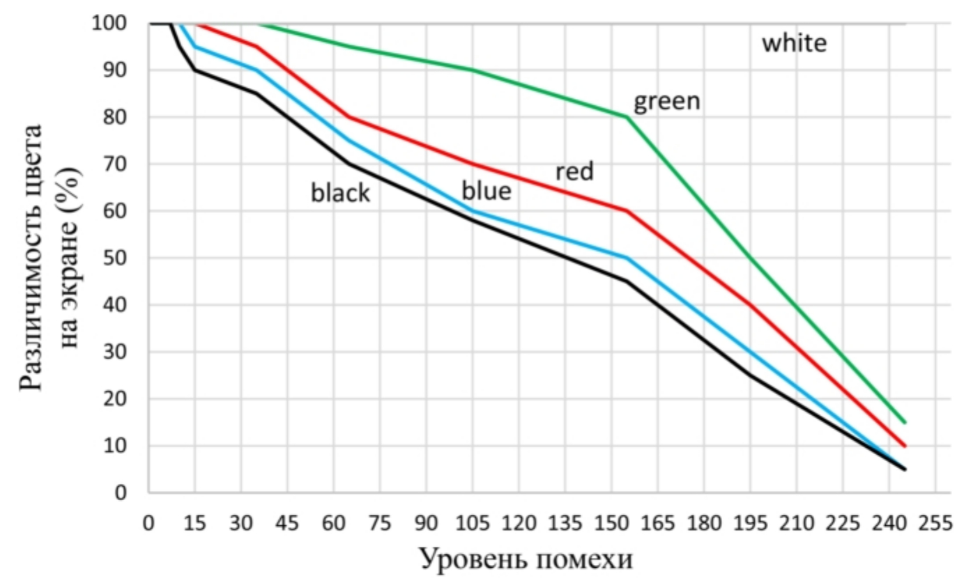 Рис. 10. График зависимости различимости цвета на экране (для стандартного наблюдателя) от уровня помех / Fig. 10. Graph of the dependence of color visibility on the screen (for a standard observer) on the level of interference