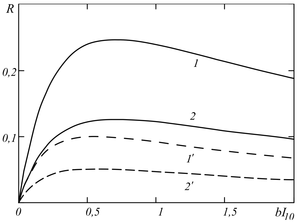 Figure 1, in the approximation of a small reflection coefficient (the transfer of energy from the object wave to the signal wave, self-diffraction of the second pump wave is neglected) under the condition of equal intensities of pump waves on the faces of the nonlinear layer where presents the characteristic dependence of the reflection coefficient on the normalized intensity of pump waves in the presence (curves 1', 2') and absence (curves 1’ and 2’) of feedback for the object and signal waves. With increasing intensity of the pump waves, the reflection coefficient increases, reaches its highest value, and then slowly decreases. At the optimal value for the intensity of the pump waves the reflection coefficient takes the maximum value.