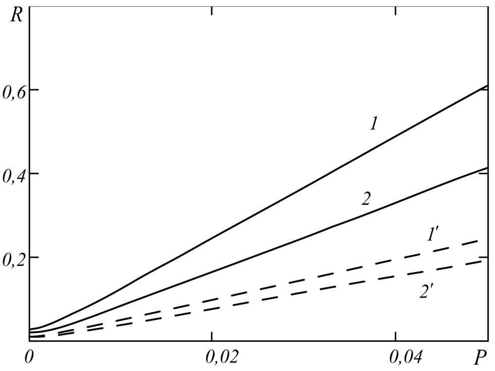 Fig. 2. Dependence of the reflection coefficient of a four-wave radiation converter on the parameter P at (1, 2), (1, 2)