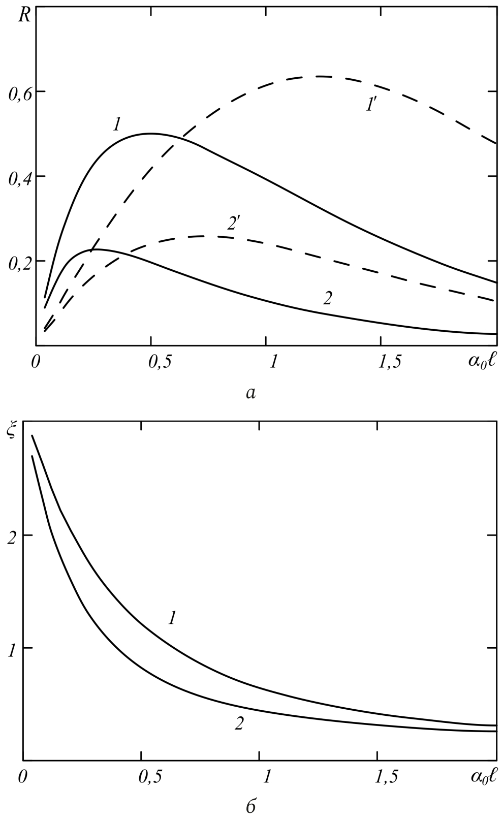 Рис. 4. Зависимость коэффициента отражения (а), отличия в коэффициентах отражения (б) от коэффициента поглощения при (1, 2), (1, 2),