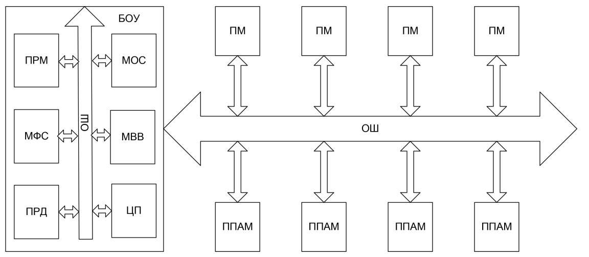 Рис. 1. Базовые устройства бортового радиотехнического комплекса: БОУ – блок управления и обработки; ПРМ – приемный модуль; МОС – модуль обработки сигналов; МФС – модуль формирования сигналов; МВВ – модуль ввода/вывода; ЦП – центральный процессор; ПМ – пеленгационный модуль; ОШ – общая шина; ППАМ – приемо-передающий антенный модуль