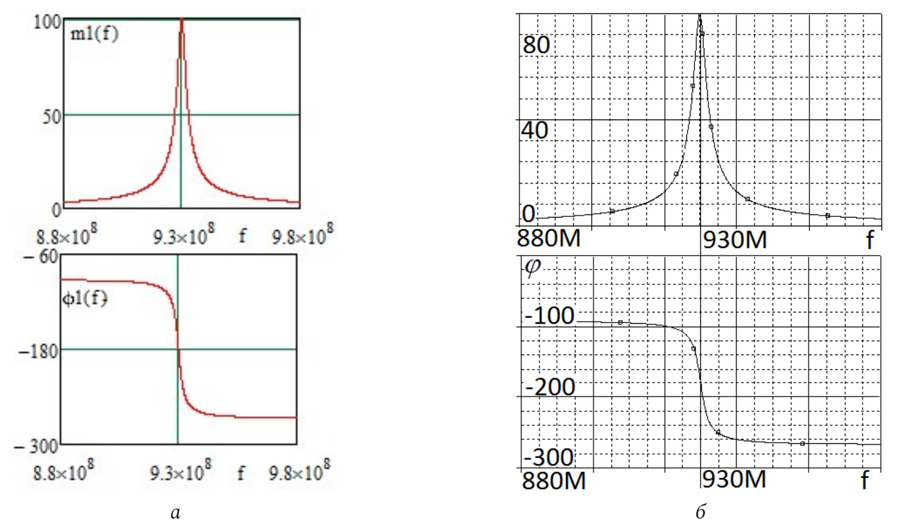ƒ ≈ 930 МГц (рис. 9, а и б) незначительно отличается от средней частоты принципиальной схемы ƒ ≈ 930 МГц (рис. 6, б). Значения модулей передаточной функции принципиальной и эквивалентной схем усилителя равны m =100.
