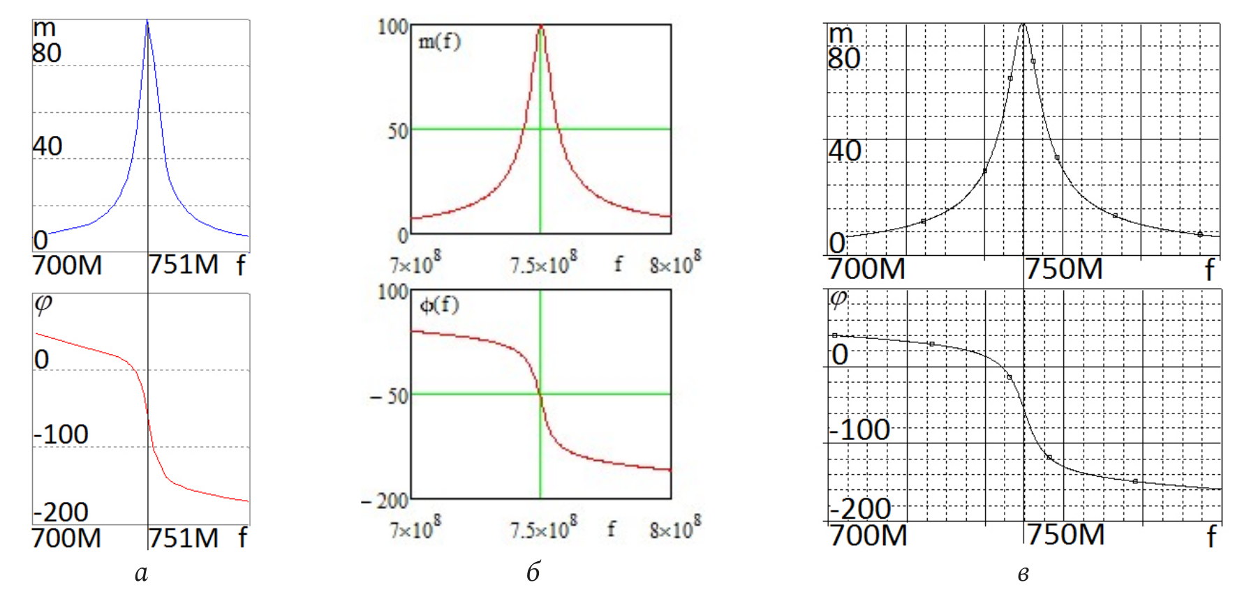 Рис. 12. Частотные характеристики (АЧХ и ФЧХ) принципиальной (рис. 10) и эквивалентной схемы (рис. 11), полученные системах MicroCap (а) MathCad (б) и OrCad (в)