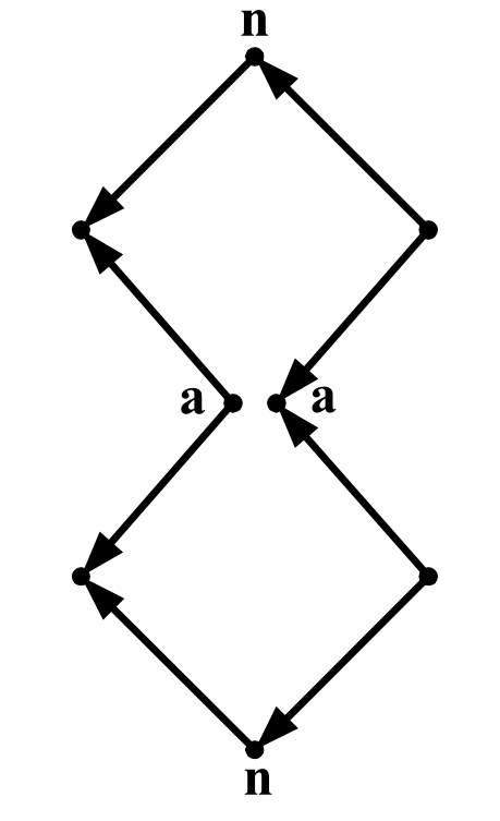 Полотно зигзагообразной антенны К.П. Харченко образовано восемью проводниками, которые соединены в виде двух ромбовидных ячеек (рис. 1). К точкам питания a-a подключается фидер. При питании антенны коаксиальным кабелем, который прокладывается через точку нулевого потенциала не требуется симметрирующего устройства, так как в точках соединения проводников n-n находится пучность тока и ноль напряжения в независимости от длины волны, что и делает антенное полотно диапазонным, поскольку полуволновые участки проводников в области точек n-n всегда имеют одинаковое направление токов (на рисунке указано стрелками), то есть находятся в одинаковой фазе. Показанная на рис. 1 антенна имеет горизонтальную поляризацию. Расчетные значения коэффициента направленного действия (КНД) и коэффициента стоячей волны по напряжению (КСВН) для участка диапазона 250…600 МГц (длина стороны ромбовидной ячейки 23 см) отображены на рис. 2 в виде графиков.