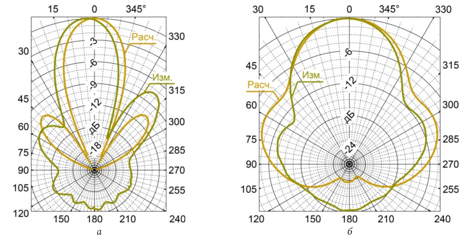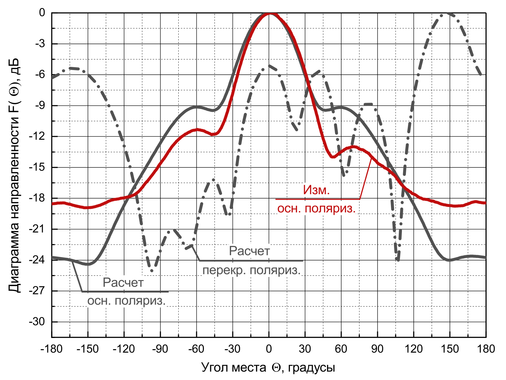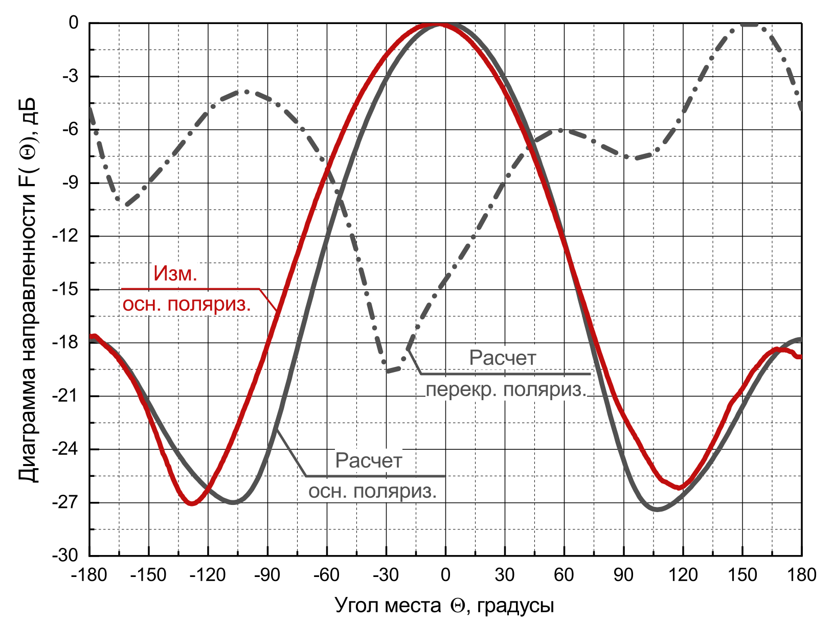 Для оценки величины кроссполяризационной развязки расчетные и измеренные нормированные диаграммы направленности в вертикальной и горизонтальной плоскостях на основной и перекрестной поляризациях приведены в декартовой системе координат на рис. 8–13.