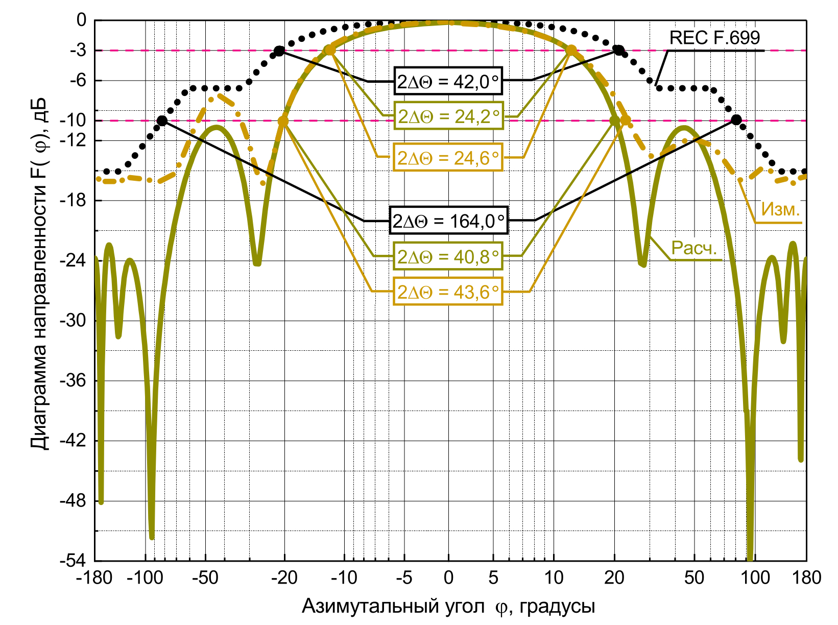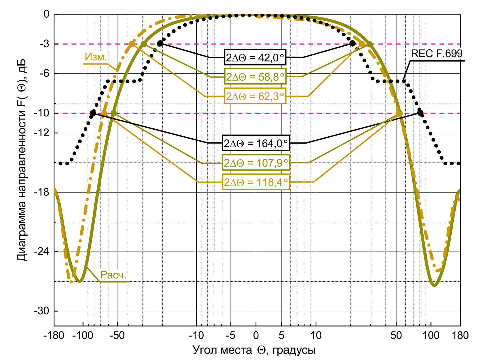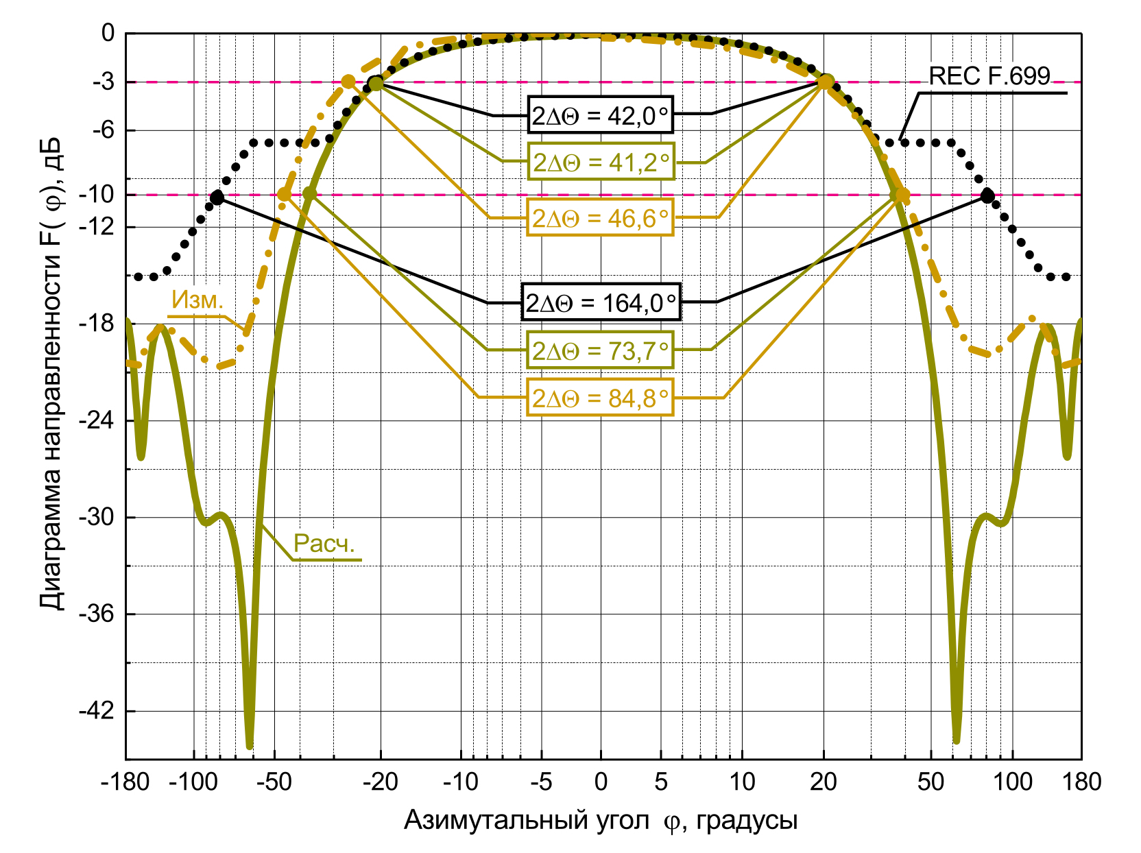 По ширине расчетные и измеренные ДН на начальной частоте Fl в вертикальной (рис. 15) и горизонтальной (рис. 14) плоскостях по уровню –3 дБ и –10 дБ превышают значения справочных диаграмм Рекомендаций МСЭ Rec. ITU-R F.699. На центральной и конечной частотах F0 и Fh в вертикальной (рис. 17, 19) и горизонтальной (рис. 16, 18) плоскостях расчетные и измеренные ДН удовлетворяют требованиям указанной рекомендации, в том числе и по уровню заднего излучения на всех трех рассматриваемых частотах.