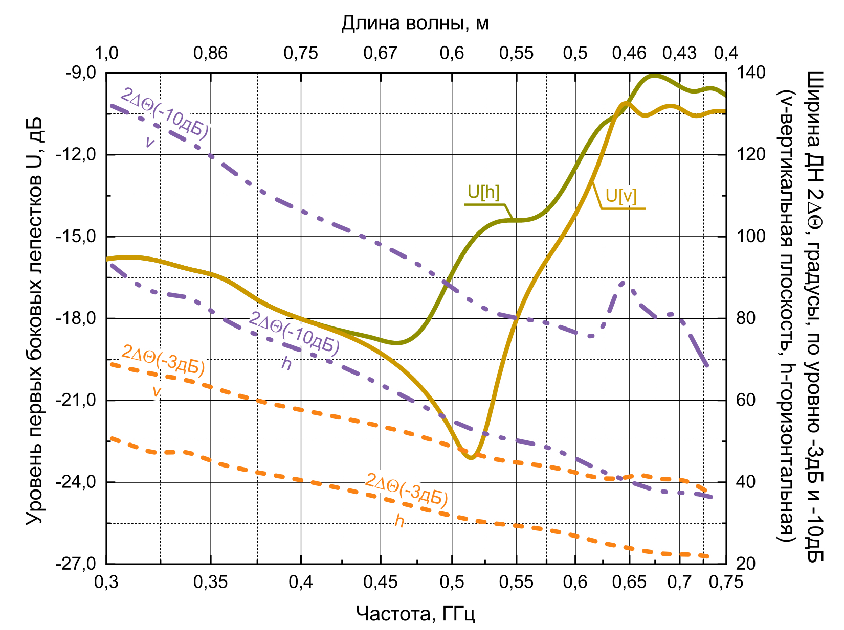 Расчетные значения уровней первых боковых лепестков (УПБЛ) в вертикальной и горизонтальной плоскостях (рис. 20) совпадают в полосе частот от 300 до 425 МГц. Минимальные значения УПБЛ –23,1 дБ наблюдаются в вертикальной плоскости на частоте 513 МГц и –18,9 дБ на частоте 462 МГц в горизонтальной плоскости. Максимум УПБЛ в горизонтальной плоскости –9 дБ имеется на частоте 675 МГц, в вертикальной плоскости –10,1 дБ на частоте 645 МГц. УПБЛ в горизонтальной плоскости выше чем в вертикальной.