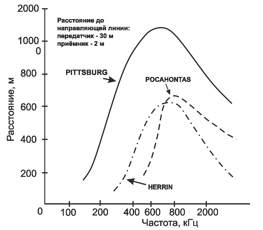 Fig. 2. Frequency dependence of the communication range along guide lines using MW radio stations with magnetic antennas [4]