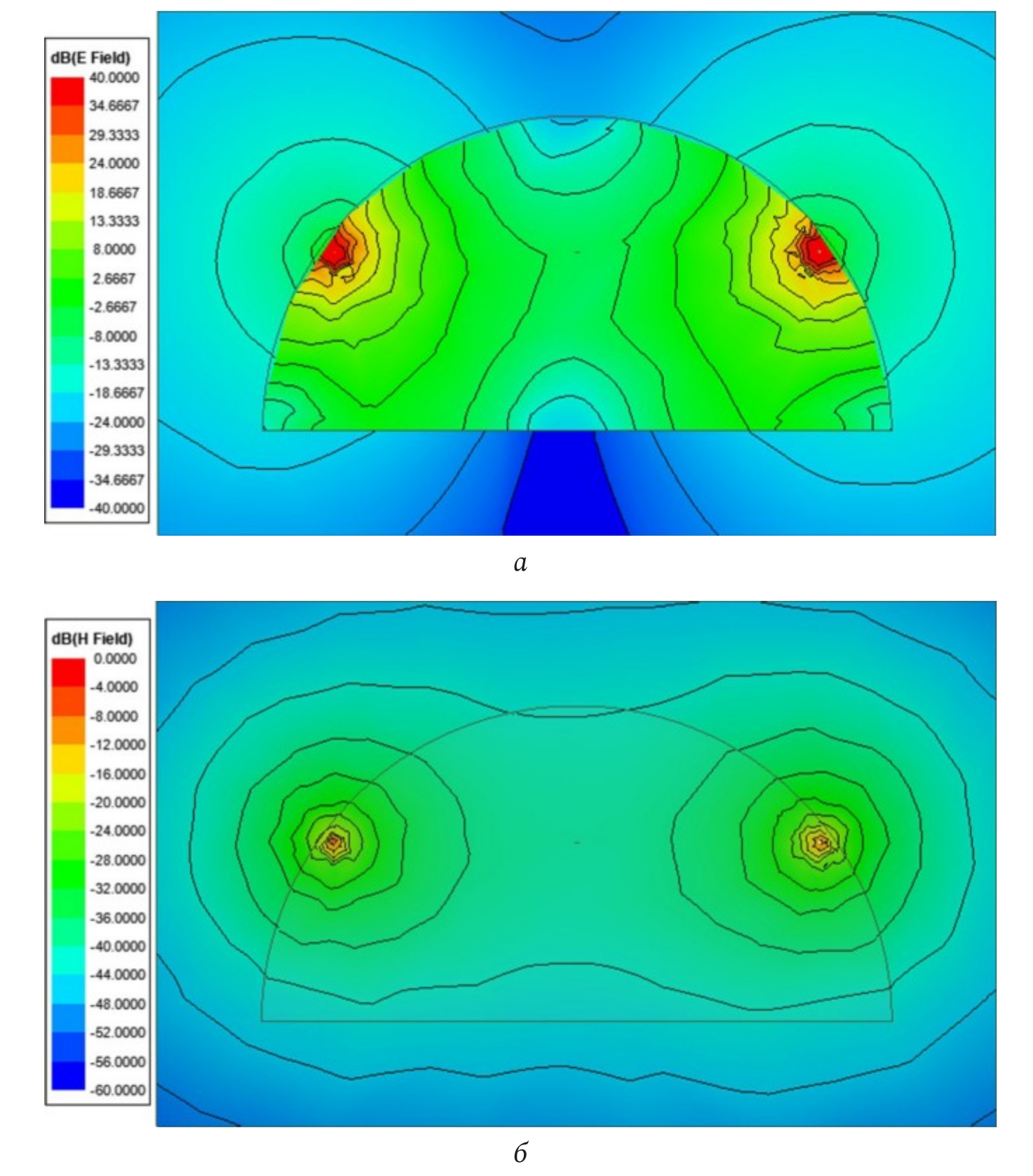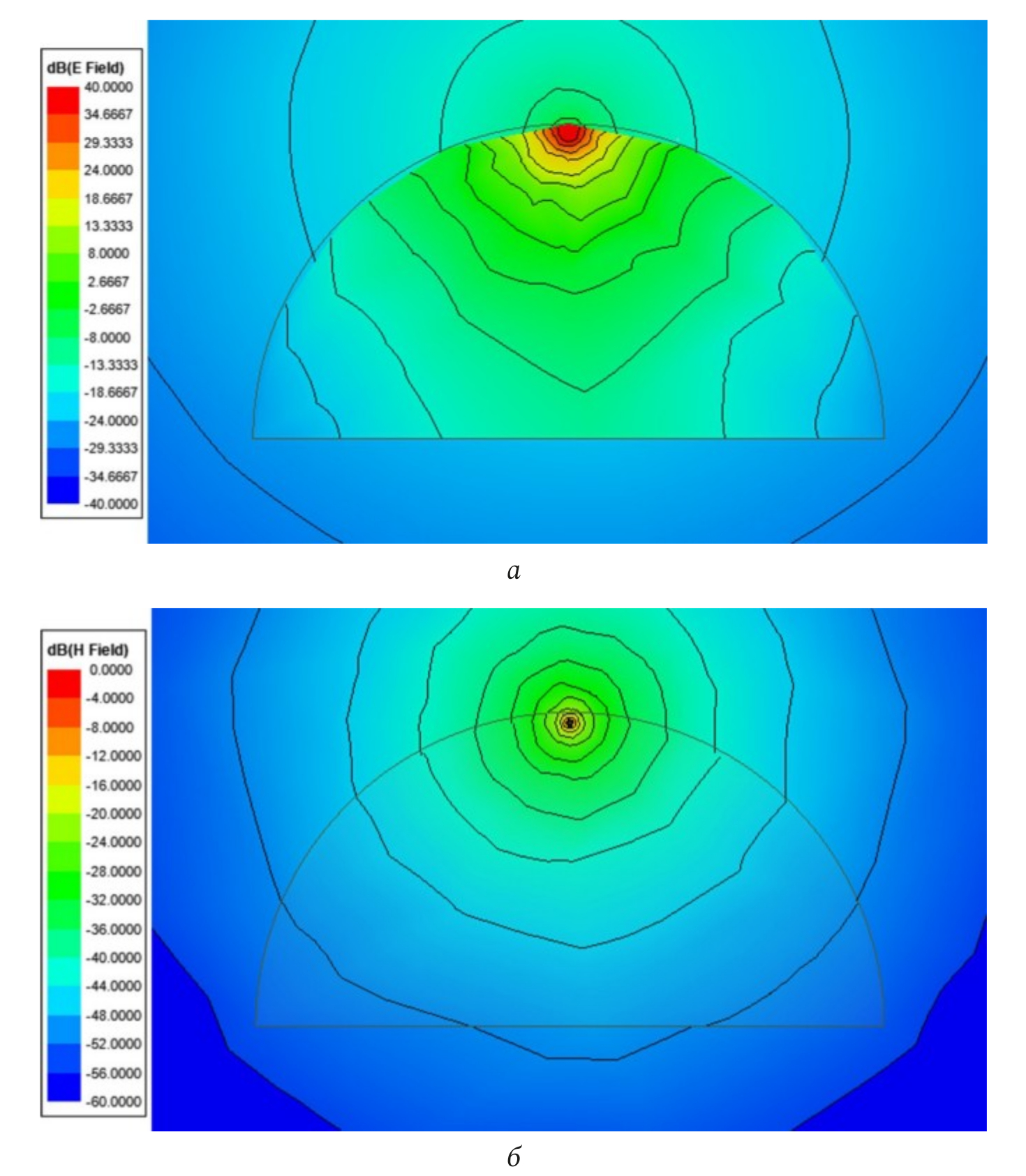 Рис. 4. Визуализация картины поля в туннеле полуцилиндрической формы с радиусом 2 м на частоте 1 МГц для ДНЛ: а – электрическое поле; б – магнитное поле