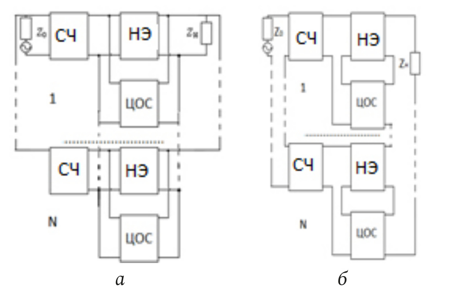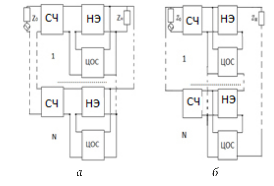 Рис. 1. Структурные схемы многокаскадных радиоустройств с параллельной по напряжению (а) и последовательной по току (б) ЦОС, включенными между СЧ и нагрузкой