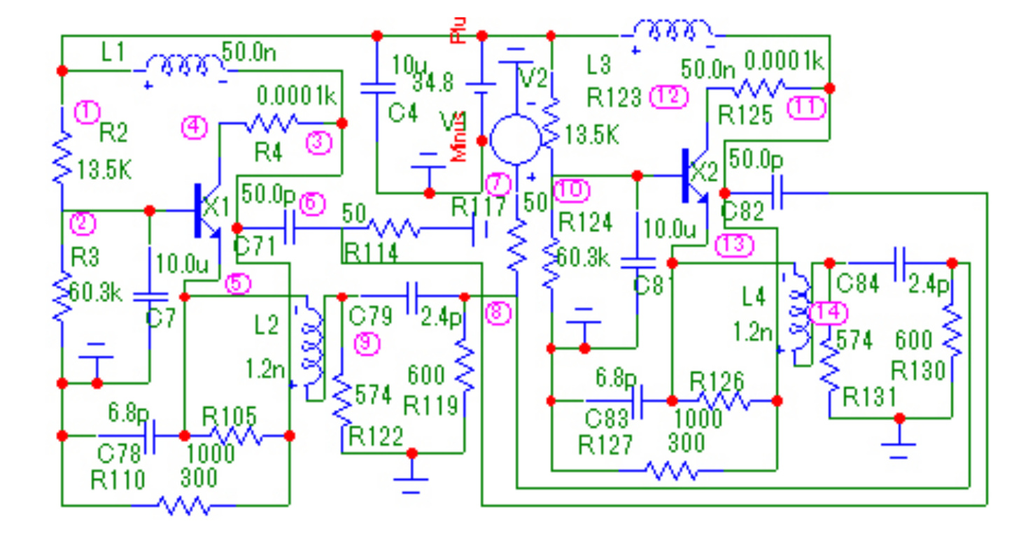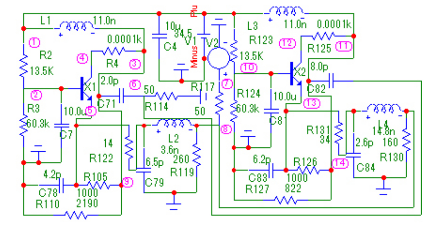 Рис. 8. Принципиальная схема двухкаскадного усилителя с неодинаковыми каскадами, соответствующая структурной схеме (рис. 1, а), исследуемая в системе MicroCap, частотные характеристики которой показаны на рис. 10, а