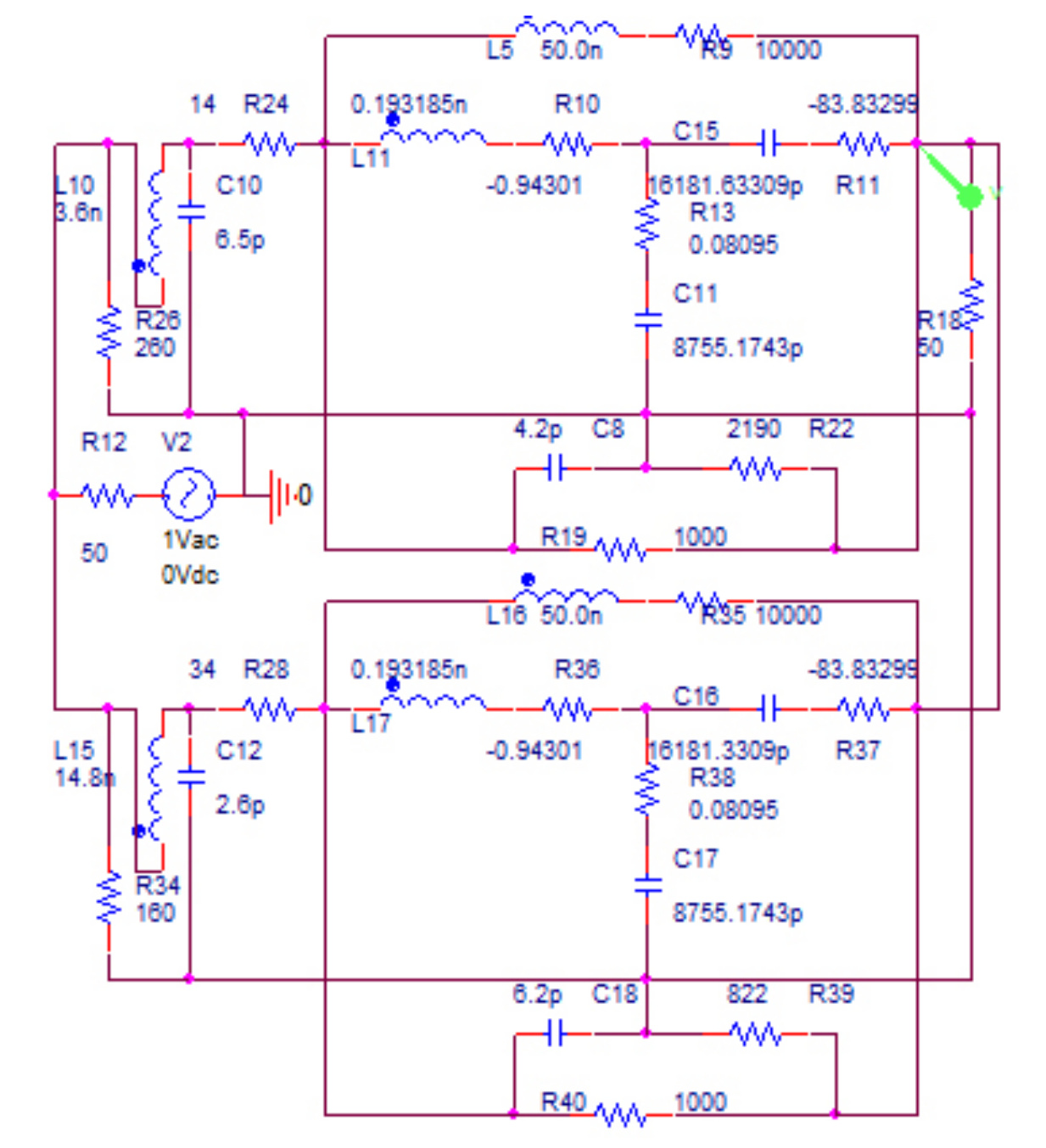 Рис. 10. Эквивалентная схема усилителя из двух неодинаковых каскадов (рис. 8), соответствующая структурной схеме (рис. 1, а), исследуемая в системе MathCad (рис. 9, б) и OrCad (рис. 9, в)