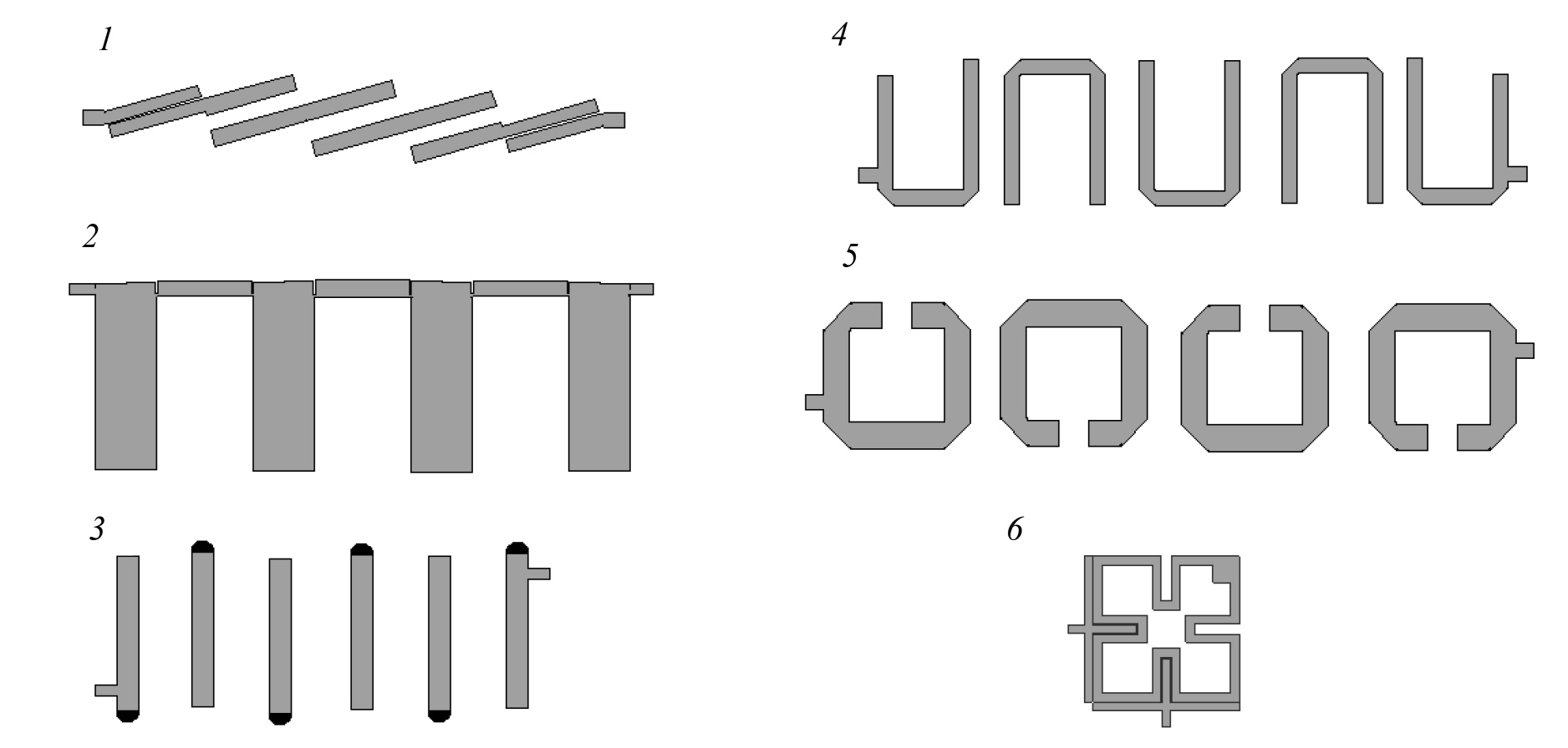 Рис. 3. Основные типы МПФ: 1 – фильтр с разомкнутыми параллельно связанными полуволновыми резонаторами; 2 – фильтр на соединенных резонаторах, не закороченных на «землю»; 3 – фильтр на четвертьволновых встречных полосках, закороченных на одном конце; 4 – фильтр на полуволнах подковообразных (шпилечных) резонаторах; 5 – фильтр на кольцевых резонаторах; 6 – фильтр кольцевого типа