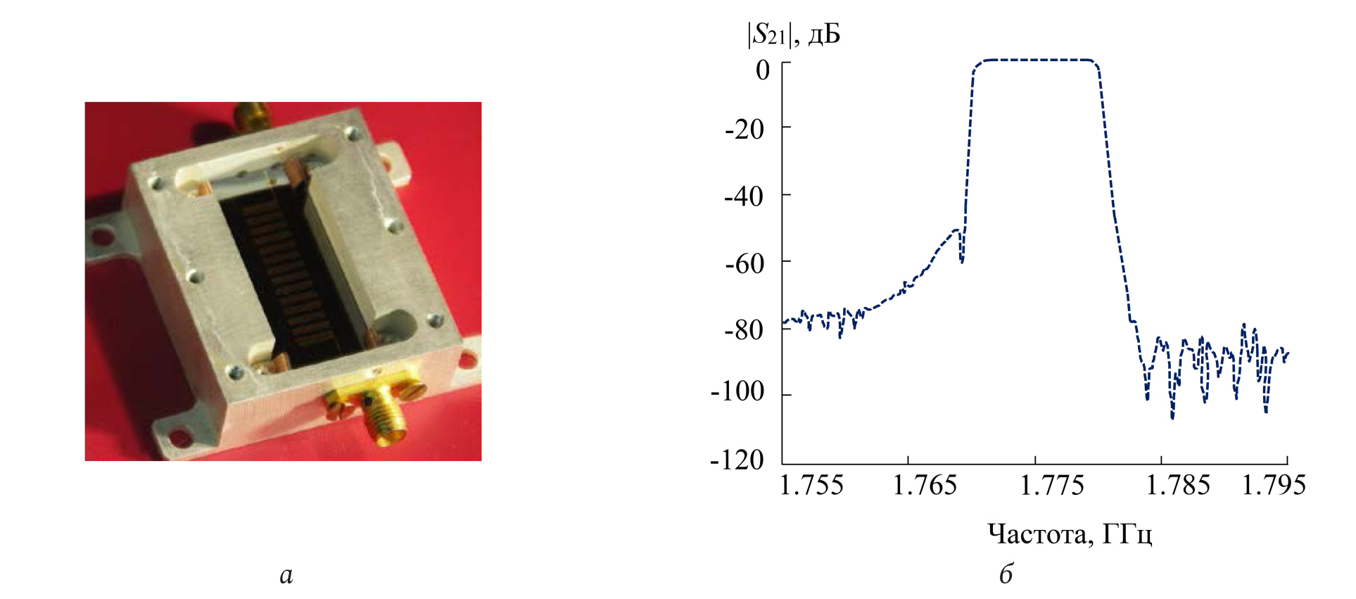 Выполнение печатных проводников СВЧ интегральных схем (ИС) на основе ВТСП позволяет улучшить характеристики пассивных СВЧ-устройств, таких как планарные полоснопропускающие и полоснозаграждающие СВЧ-фильтры с предельно высокой частотной избирательностью и низкими вносимыми потерями; разделители частотных каналов (мультиплексоры и управляемые банки фильтров). ВТСП – микрополосковые фильтры СВЧ-диапазона, обладающие существенным преимуществом по сравнению с традиционными СВЧ-фильтрами в интегральном исполнении. Так, резонаторы, выполненные на пленках ВТСП, имеют высокую собственную добротность, что позволяет обеспечить вносимые потери 0,2–1 дБ для СВЧ-фильтров с относительной шириной полосы пропускания 5–0,3 % соответственно. На рис. 5 представлен пример реализации ПФ на ВТСП 14-го порядка на S-образных резонаторах и АЧХ ВТСП-фильтра 12-го порядка для базовой станции сотовой связи со следующими параметрами: полоса пропускания – 0,5 %, вносимые потери – 0,5 дБ (T = 60 K), крутизна фронтов – 40 дБ/МГц, габариты фильтра 35 мм 20 мм [12].