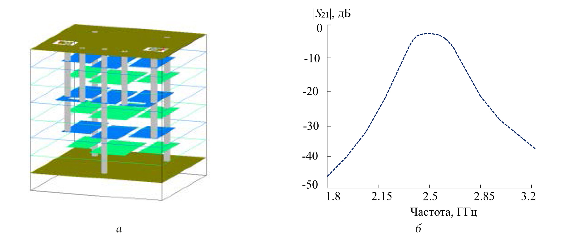 Рис. 6. Трехзвенный ПФ с Чебышевской характеристикой, реализованный с использованием квазисосредоточенных элементов: а – многослойная керамическая структура; б – АЧХ