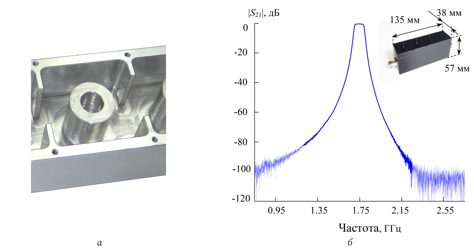 На рис. 7 представлены топология и характеристики трехзвенного полосно-пропускающего Чебышевского фильтра с полосой пропускания 100 МГц (4,6 %) на емкостно-нагруженных объемных резонаторах [18]. Связь между соседними резонаторами в составе фильтра организована при помощи диафрагмы в смежной стенке. Габаритные размеры фильтра составляют мм3. По результатам экспериментального исследования потери, вносимые фильтром в полосе пропускания, не превышают 1,2 дБ, коэффициент отражения по входу – меньше –22 дБ.